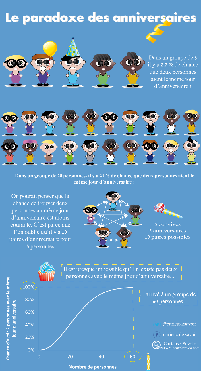 On appelle le paradoxe des anniversaires le fait qu’il est plus probable de trouver, au sein d’un groupe, deux personnes qui sont nées le même jour du même mois que ce que l’on peut intuitivement penser. En réalité ce n’est pas un paradoxe au sens mathématique, car les probabilités nous prédisent très bien la situation. Mais c’est contre-intuitif à cause du grand nombre de jours qu’il y a dans une année.Une probabilité, c’est quoi ?