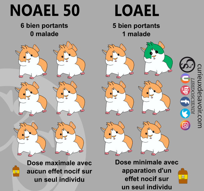 - La dose minimale entraînant un effet nocif observé (DSENO ou LOAL en anglais) est la dose à laquelle les premiers effets sont visibles sur les animaux testés.